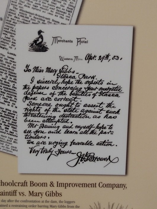 The story continues with Governor Van Sant more-or-less abdicating authority to the District Attorney in quite the Pontius Pilate move. An injunction was issued to prevent future over-flooding. The lumber industries fought the District Attorney and fought the injunction, garnering several small victories along the way. Their biggest victory came was injunction of their own barring Mary from any further intrusion on their business practices. However, the real victory is much easier to see. Mary Gibbs' putting her personal safety on the line, just doing her job that critical day, saved Itasca State Park, and by extension the old-growth forest and the Mississippi River headwaters, for future generations. End of story.